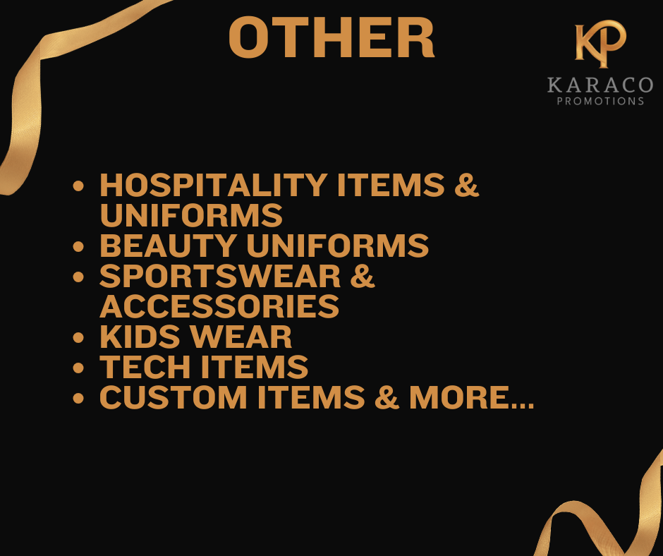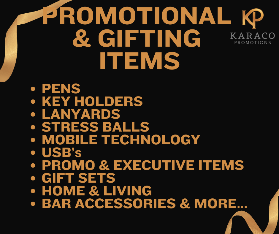 Karaco Promotions (Pty) Ltd was established in 2012 as a supplier of corporate gifting and clothing items to all South African companies, and recently introduced signage as an additional service.